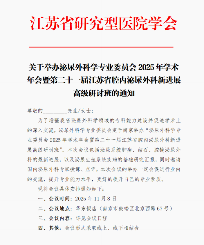 关于举办泌尿外科学专业委员会2025年学术年会暨第二十一届江苏省腔内泌尿外科新进展高级研讨班的通知