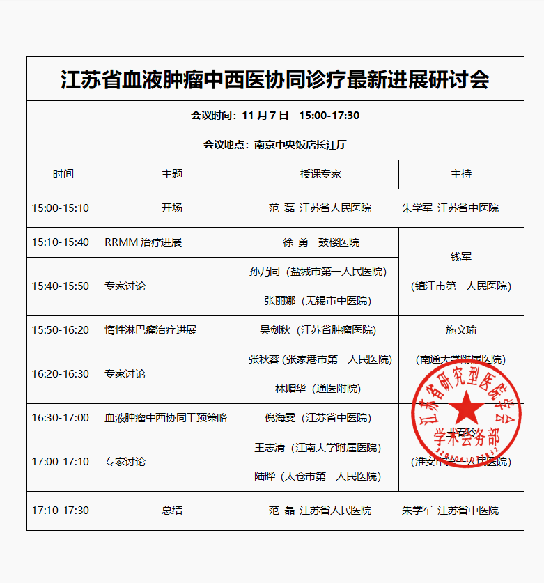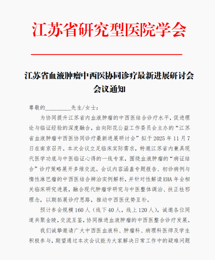 江苏省血液肿瘤中西医协同诊疗最新进展研讨会会议通知
