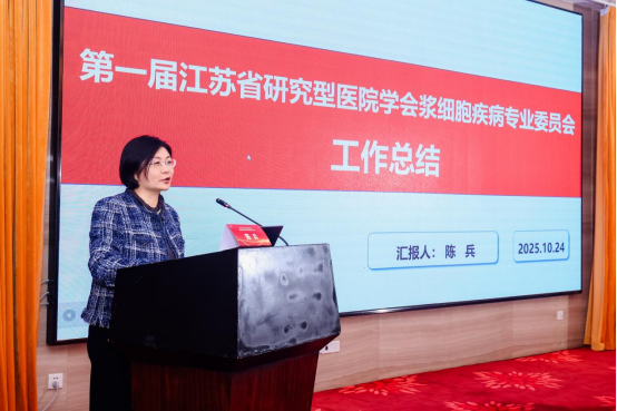 江苏省研究型医院学会浆细胞疾病专业委员会第一届主任委员陈兵主任代表上一届专委会作了详实的工作汇报。陈兵主任系统回顾了专委会自成立以来在党建工作、科普宣教、流调工作、学术交流、转化创新及公益项目等方面取得的丰硕成果。报告充分展现了上一届专委会在促进学科发展和产学研融合方面发挥的积极作用。